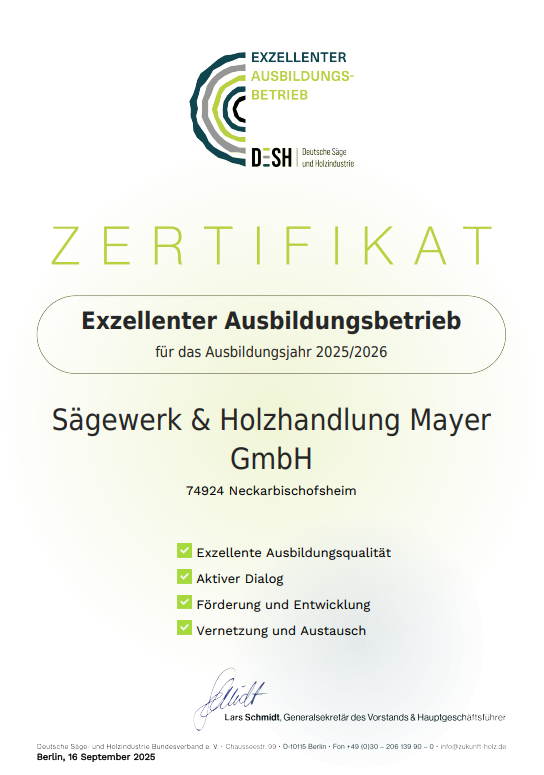 Wir freuen uns sehr, dass die Sägewerk & Holzhandlung Mayer GmbH für das Ausbildungsjahr 2025/2026 als „Exzellenter Ausbildungsbetrieb“ ausgezeichnet wurde.